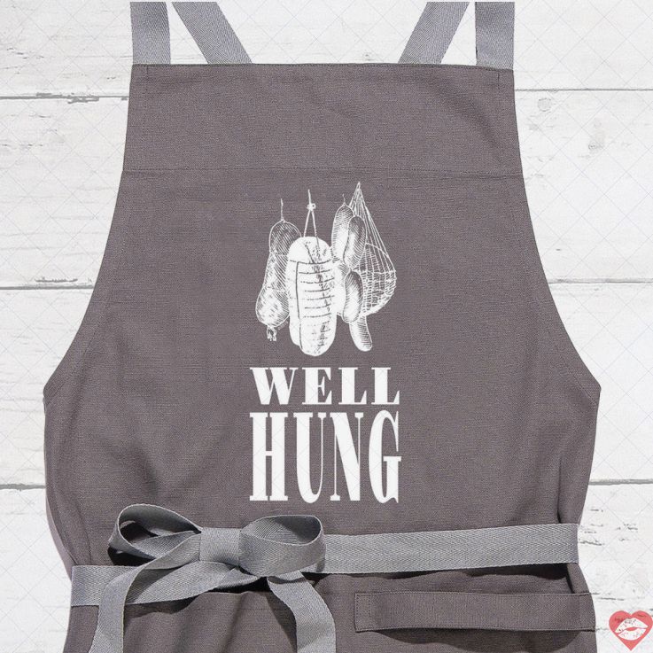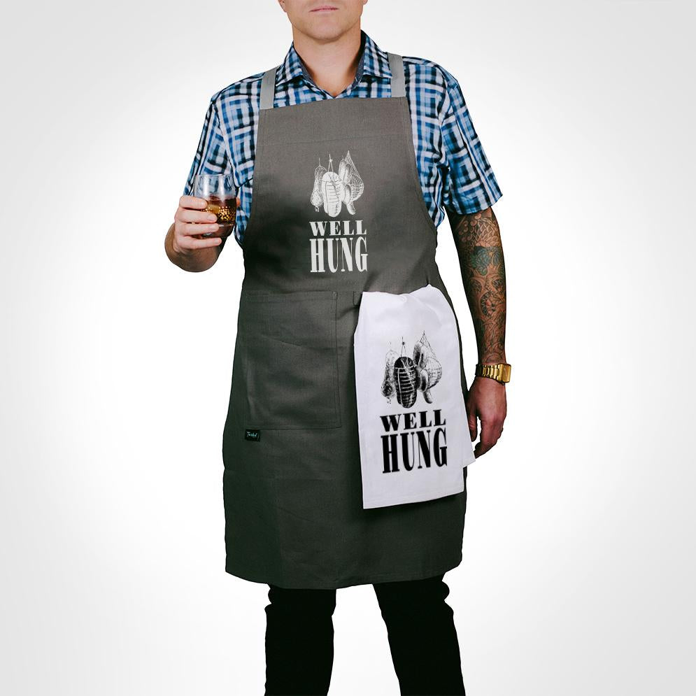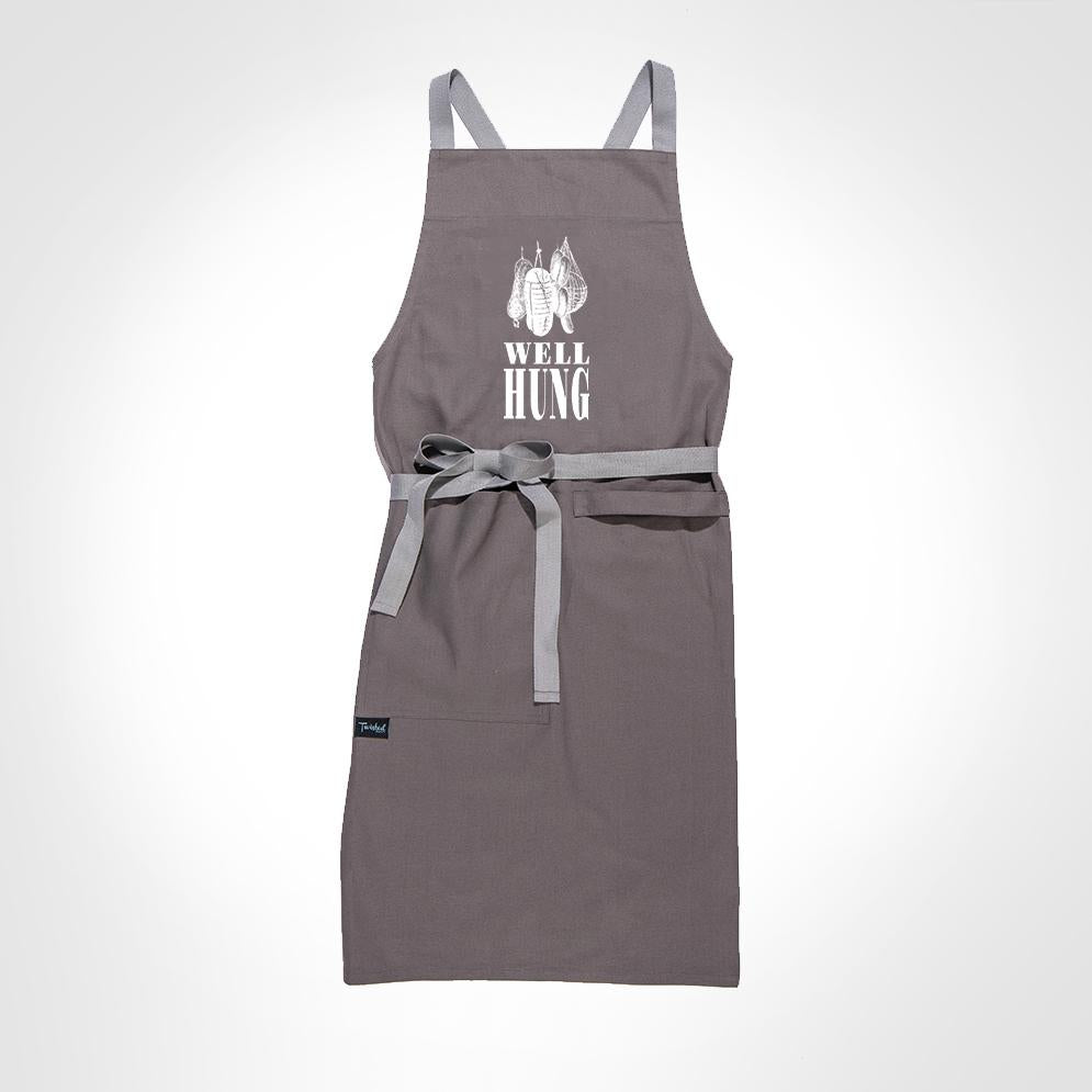 Với hình minh họa thịt treo vui nhộn kèm dòng chữ "Well Hung" to đùng, chiếc tạp dề hài hước này khiến mọi buổi nướng thịt trở nên bùng nổ tiếng cười.