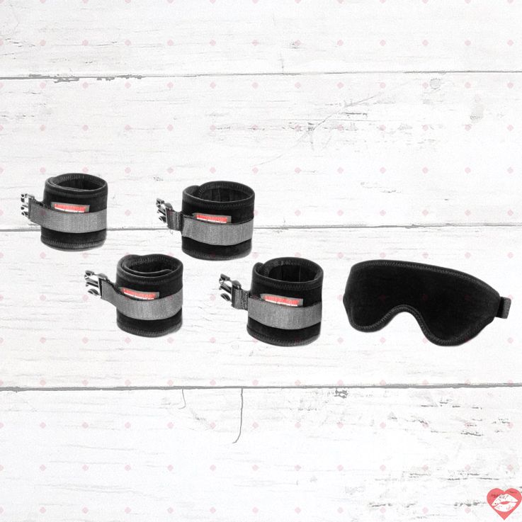 Thành phần đầy đủ: 2 còng tay (wrist cuffs) 👆, 2 còng chân (ankle cuffs) 👣, 6 đầu nối còng (cuff connectors) 🔗, và 1 bịt mắt (blindfold) 😎.