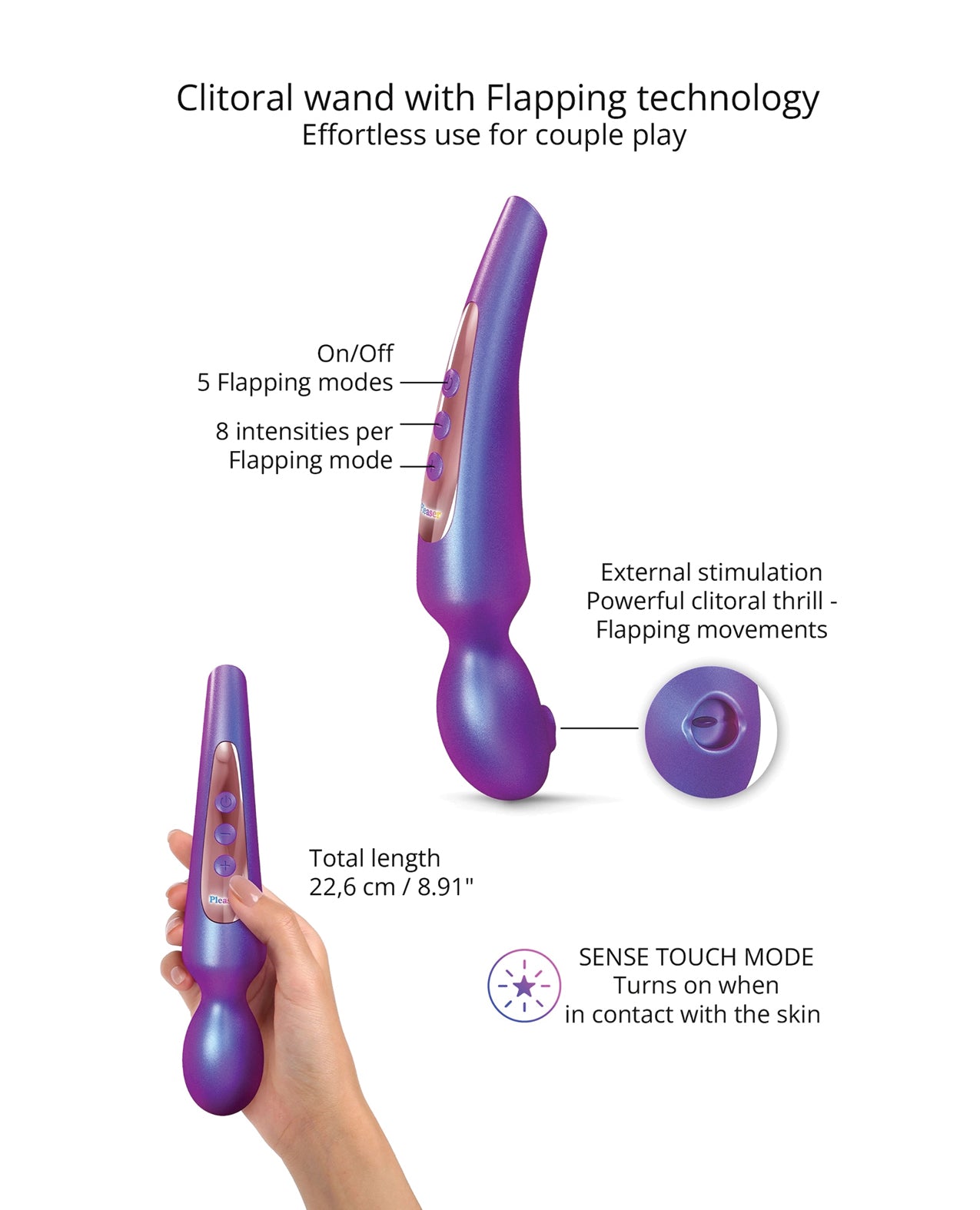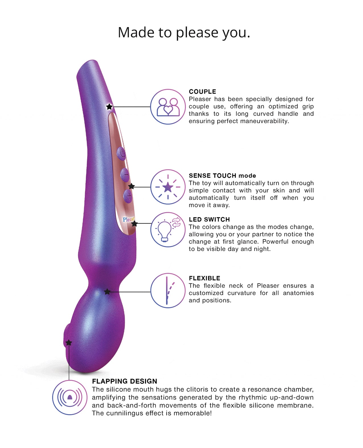 Trái tim của Pleaser Wand là 5 chế độ đánh cánh bướm với 8 mức cường độ đa dạng, từ nhịp nhẹ nhàng trêu đùa đến rung động dữ dội. Tay cầm cong ergonomic kết hợp cổ linh hoạt giúp kiểm soát chính xác, như phần mở rộng tự nhiên của bàn tay – hoàn hảo cho sử dụng solo hoặc cùng đối tác.