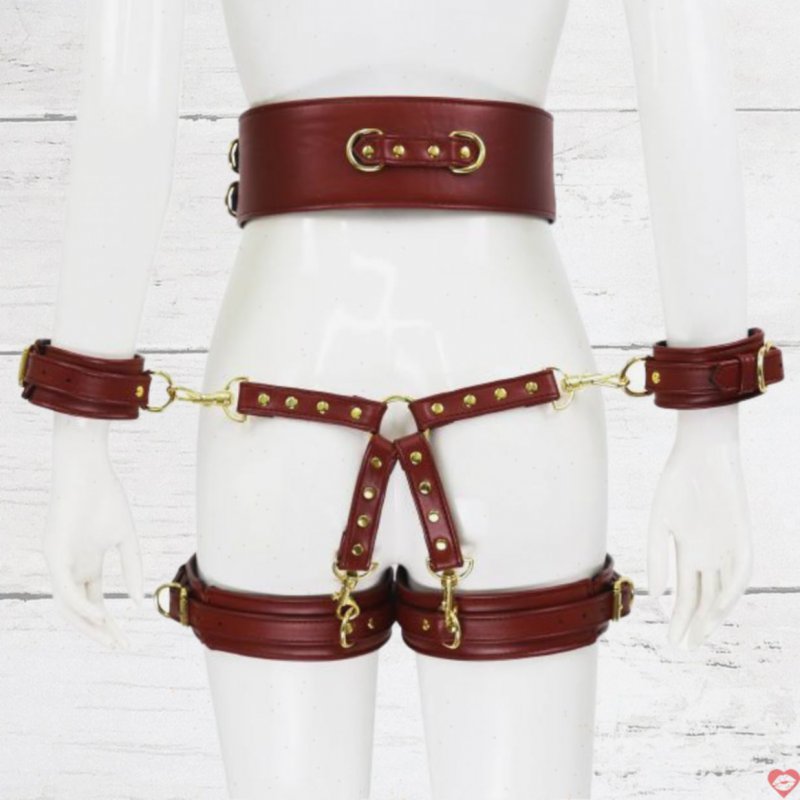 Bộ dụng cụ bạo dâm này được làm từ chất liệu da PU cao cấp với màu đỏ đậm nồng nàn, kết hợp hài hòa cùng các chi tiết kim loại màu vàng sáng bóng. Những đường đinh tán kim loại tinh xảo ở dải dây xích và các bản khóa tạo nên vẻ đẹp đầy quý phái nhưng cũng không kém phần mạnh mẽ, táo bạo. Khi khoác lên người, bộ sản phẩm biến bạn trở thành nàng nô lệ nóng bỏng đầy mê hoặc, quyến rũ mỗi ánh nhìn.